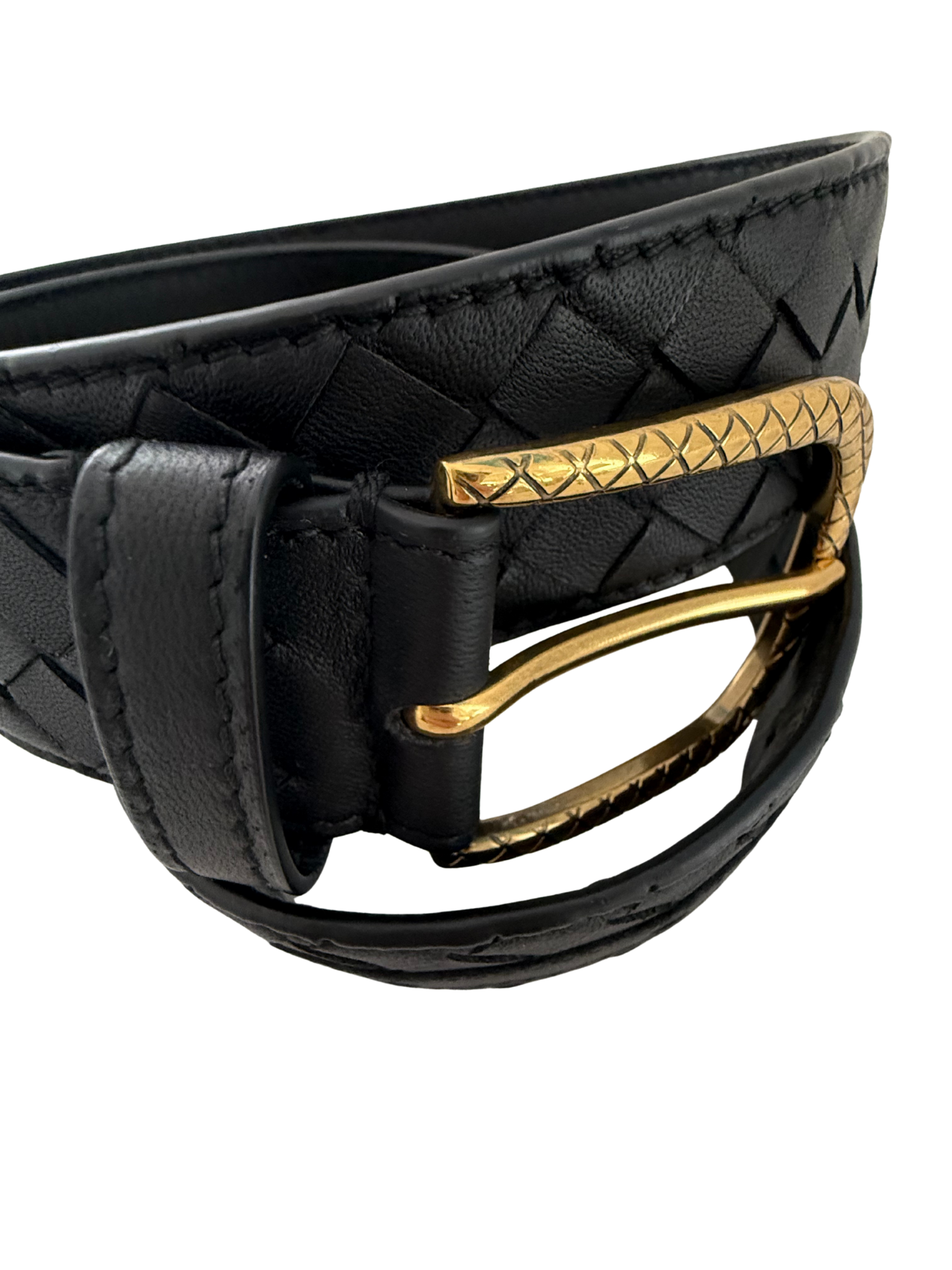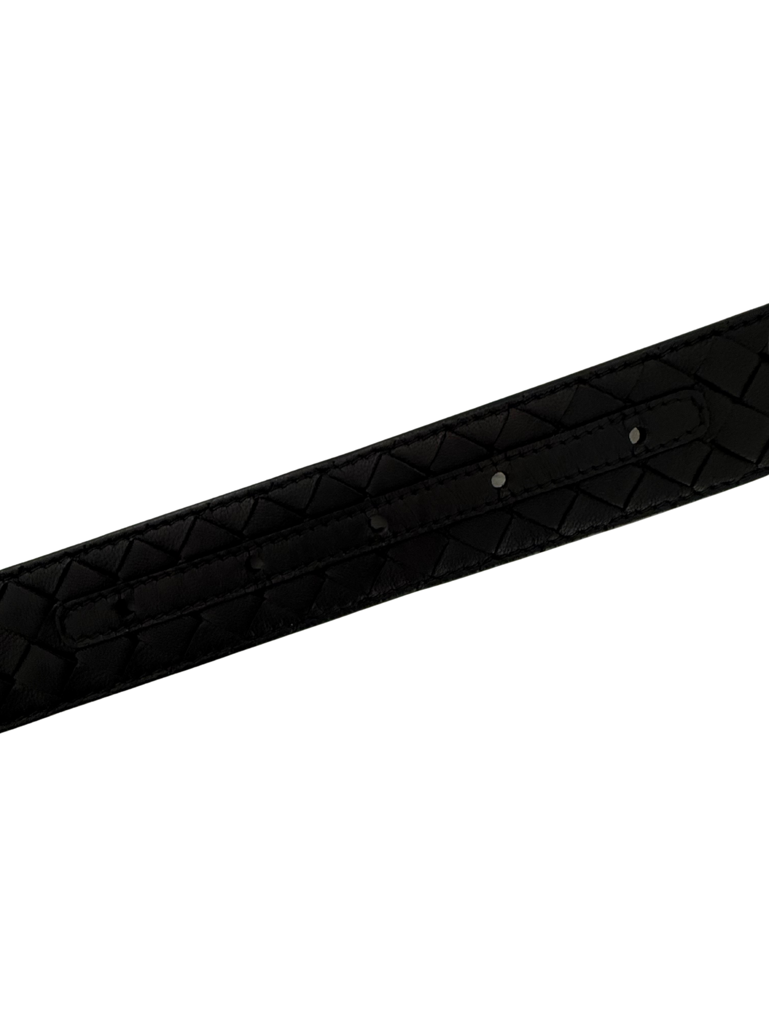 Refined craftsmanship meets timeless Italian design in this stunning Bottega Veneta Intrecciato Leather Belt. Expertly woven from supple black leather in the brand’s signature intrecciato pattern, this piece features a textured gold-tone buckle with an intricate, snake-like engraving — adding a touch of understated luxury.